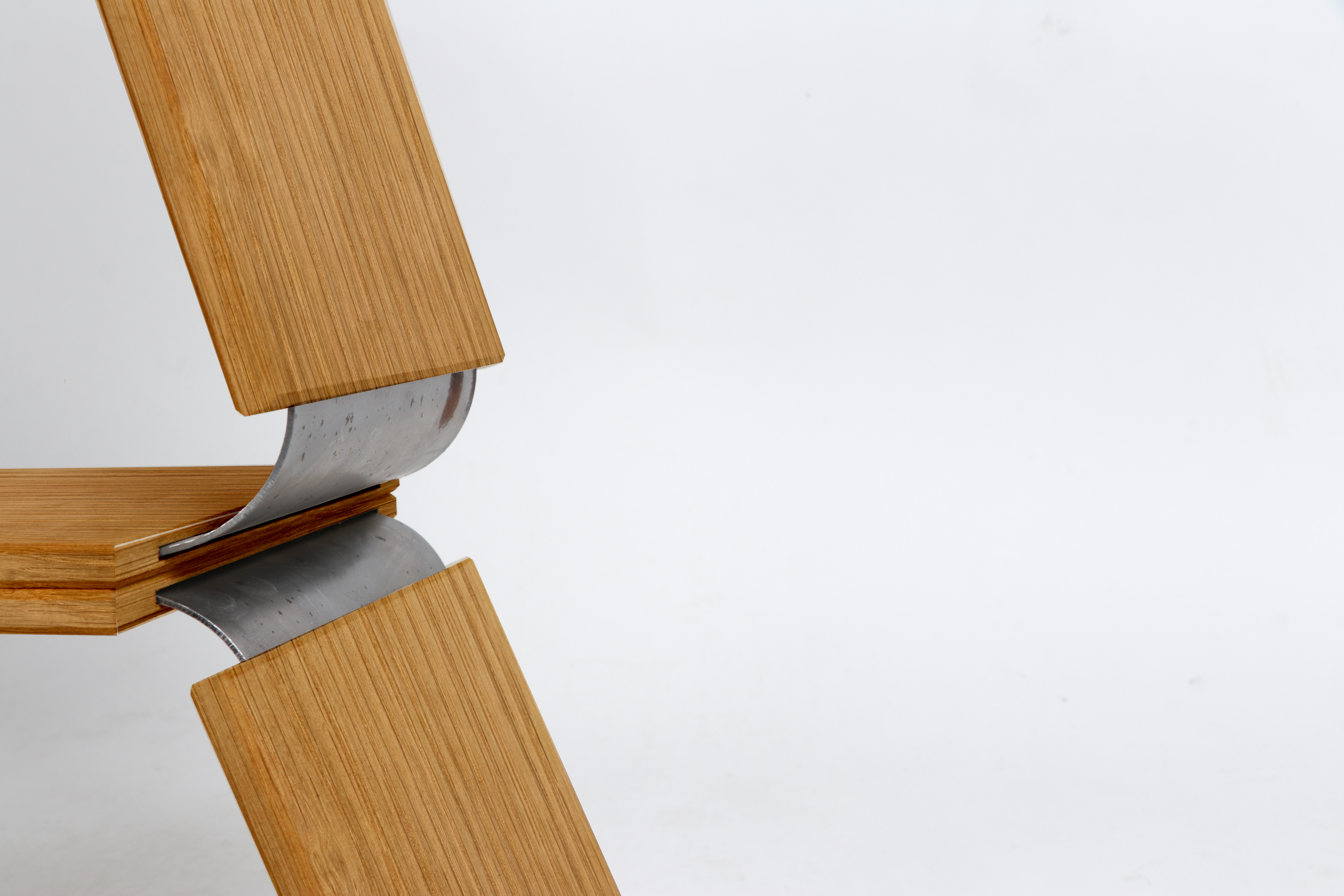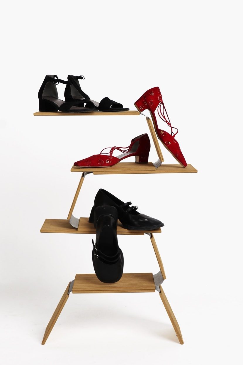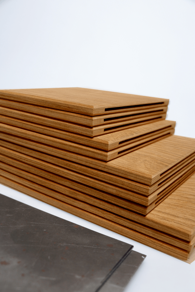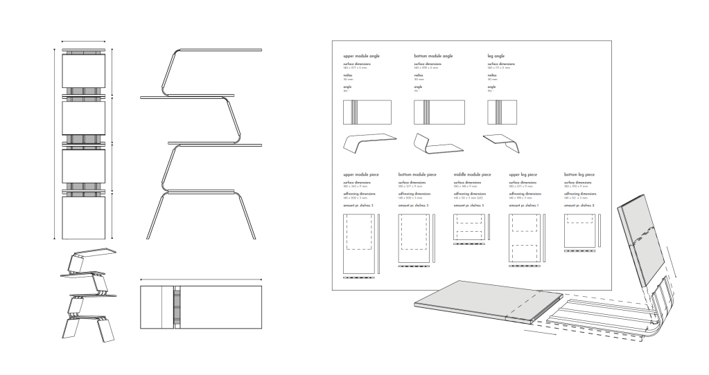 The shelves consist of three identical shelving modules and a bottom module, acting as legs. The design is made in solid oak and bended steel.