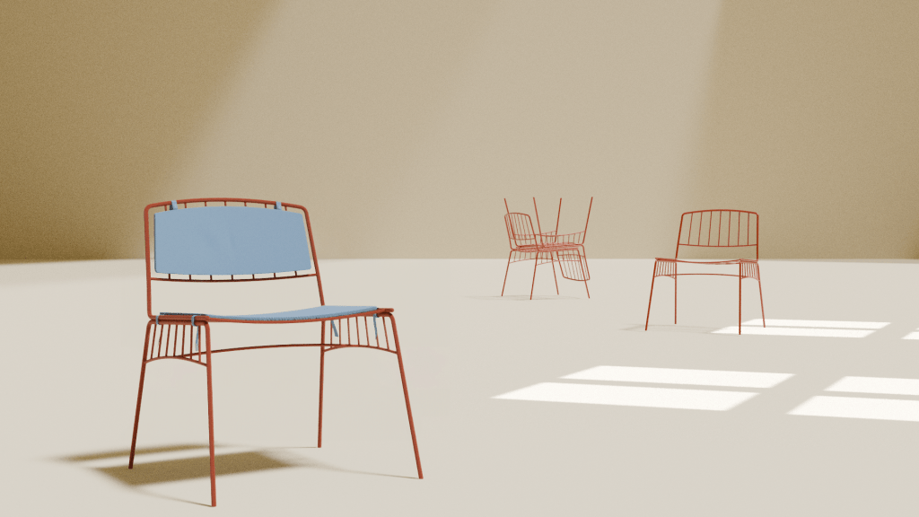 Havestolen er fremstillet af bukkede, okkerrøde stålrør i forskellige diametre. Stellet har en enkel konstruktion med jævne kurver og klare linjer.